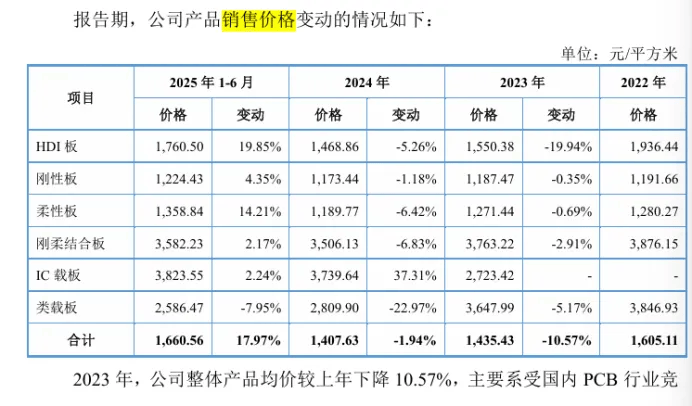 除了销量变动外,上述提及的主营产品的平均销售价格也出现了不同程度的下滑。报告期内,HDI板的的平均销售价格分别为1936.44元/平方米、1550.38元/平方米、1468.86元/平方米和1760.5元/平方米,同比变动-19.94%、-5.26%和19.85%;刚性板的平均销售价格分别为1191.66元/平方米、1187.47元/平方米、1173.44元/平方米和1224.43元/平方米,同比变动-0.35%、-1.18%和4.35%。