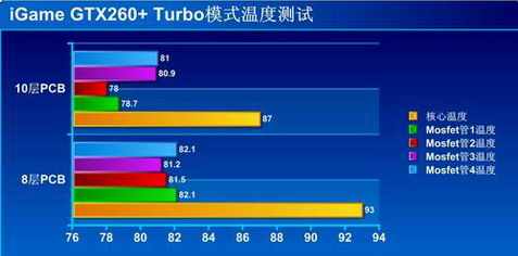 也许你认为,PCB的改变仅仅是8层到10层而已,不会太麻烦吧。其实这样的想法是错误的,PCB从8层变到10层之后,必须对电路进行重新设计,而且电路图设计完成之后进行重新打样和测试,其中包括了近百道严格的测试工序。四、为玩家特别定制的10层PCB GTX260+全新的10层PCB iGame 260+在外观上依然延续了原来的风格,具体型号为“iGame260+ GD3 UP烈焰战神896M”,全新55nm工艺的GTX 260+核心,核心编号升级到G200-103-B3,大大降低了功耗和提升了超频能力,支持DirectX10、Shader Model4等特效。