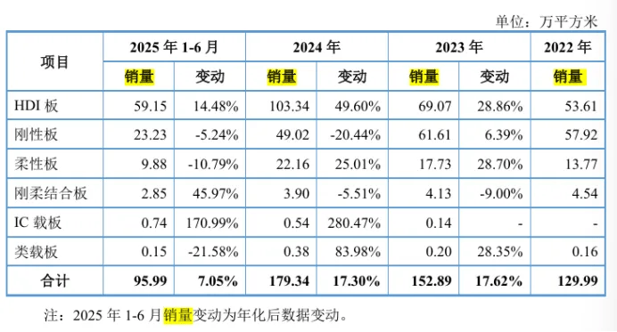 2024年、2025年1-6月,刚性板销量下降,主要系公司实施产品结构战略性调整,加速推进产品技术升级进程,提升产线和产品的适配性,重点发展HDI板产品,有计划地控制大批量刚性板产品订单承接规模。