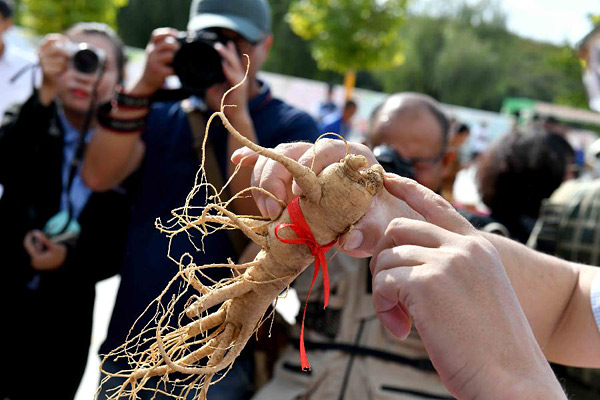 9月26日,在山东省威海市文登区张家产镇,一名评委在评判西洋参。当日,威海市文登区举行西洋参“参王”大赛,评选当季“参王”。文登区西洋参种植面积达5.5万亩,西洋参产业成为当地富民增收的主导产业之一。