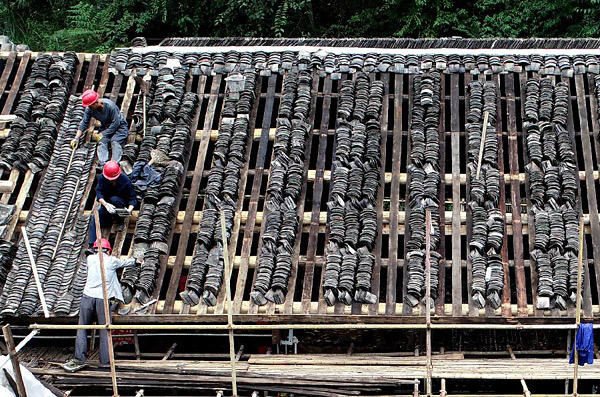 9月19日,工人在彭家寨古吊脚楼上盖瓦。今年以来,湖北省恩施土家族苗族自治州宣恩县组织精通吊脚楼修建技艺的木匠师傅,按照“整旧如旧”的原则,用传统手工艺对拥有近300年历史的彭家寨古吊脚楼群进行全面修缮。 彭家寨坐落在湖北省西部武陵山麓,被列入全国第七批重点文物保护单位。